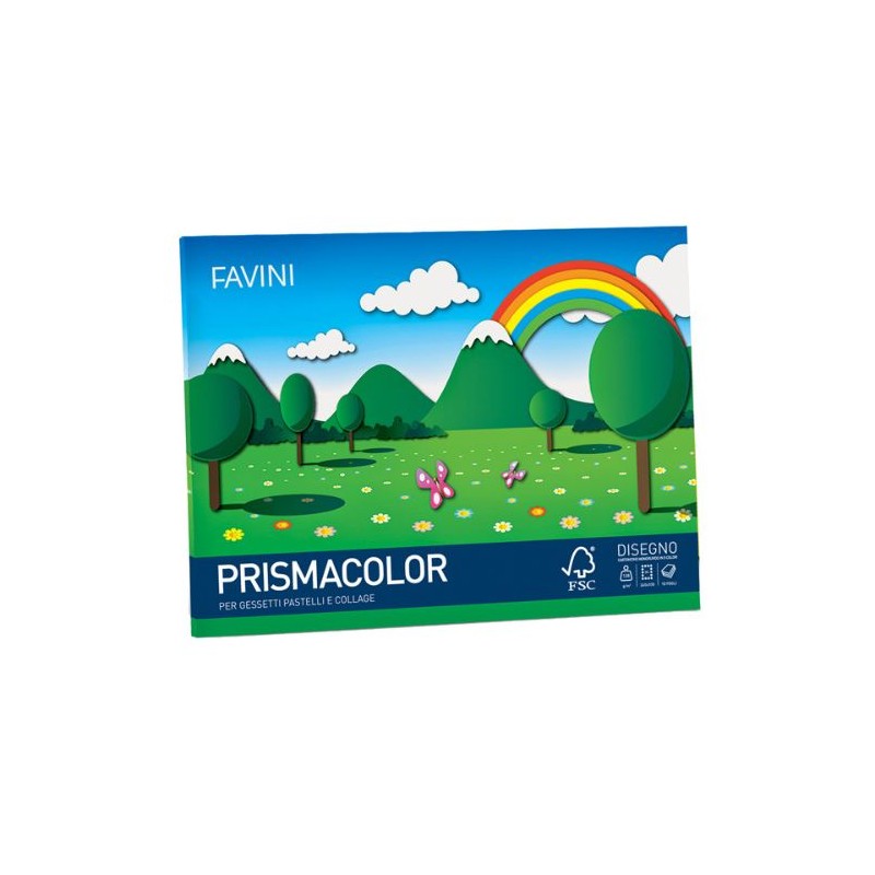 Album da 10 fogli in cartoncino monoruvido Prisma Favini da 128gr in 5 colori assortiti. Adatto per pastelli, gessetti e collage. Rilegatura a punto metallico e perforazione a stacco.