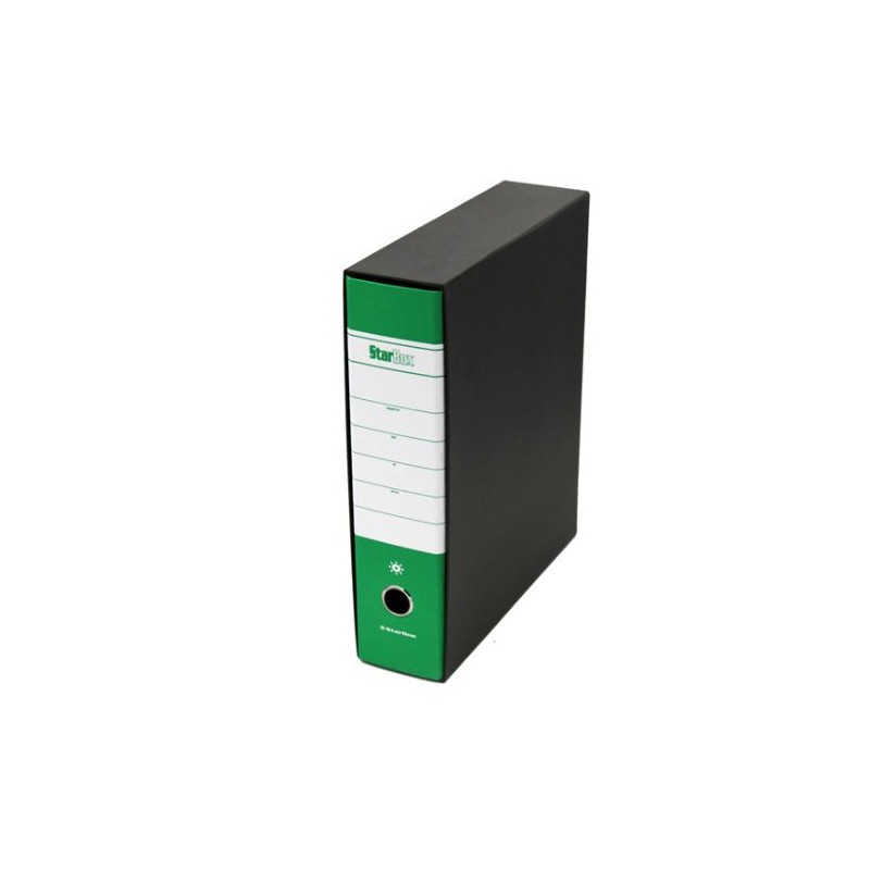 Registratore STARLINE modello StarBox, con struttura in cartone rivestita in carta goffrata stampata e risguardo bianco. Dotato di meccanismo a leva in acciaio nichelato con pressino. Custodia in fibrone nero rivestita in carta usomano. Anello di estrazione in metallo