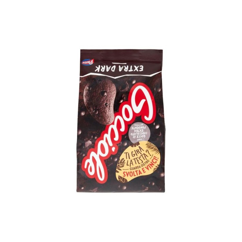 Farina di frumento, zucchero, cioccolato extra fondente 14% (pasta di cacao 71% minimo), zucchero, emulsionante: lecitina di soia, aroma naturale vaniglia), olio di girasole, amido di frumento, burro, cacao 2%, cioccolato 1,8% (zucchero, pasta di cacao, cacao magro, aroma naturale vaniglia), cacao magro 1,2%, agenti lievitanti (carbonato acido d’ammonio, carbonato acido di sodio), aromi (latte), sale.