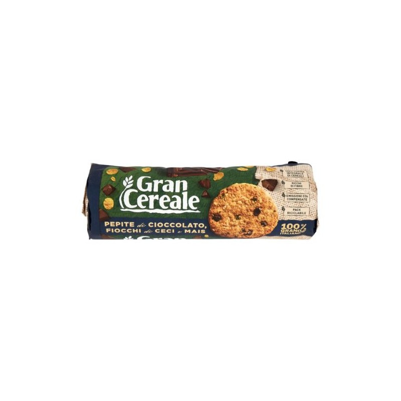 Biscotti con farina integrale di cereali, pepite di cioccolato, fiocchi di ceci e mais