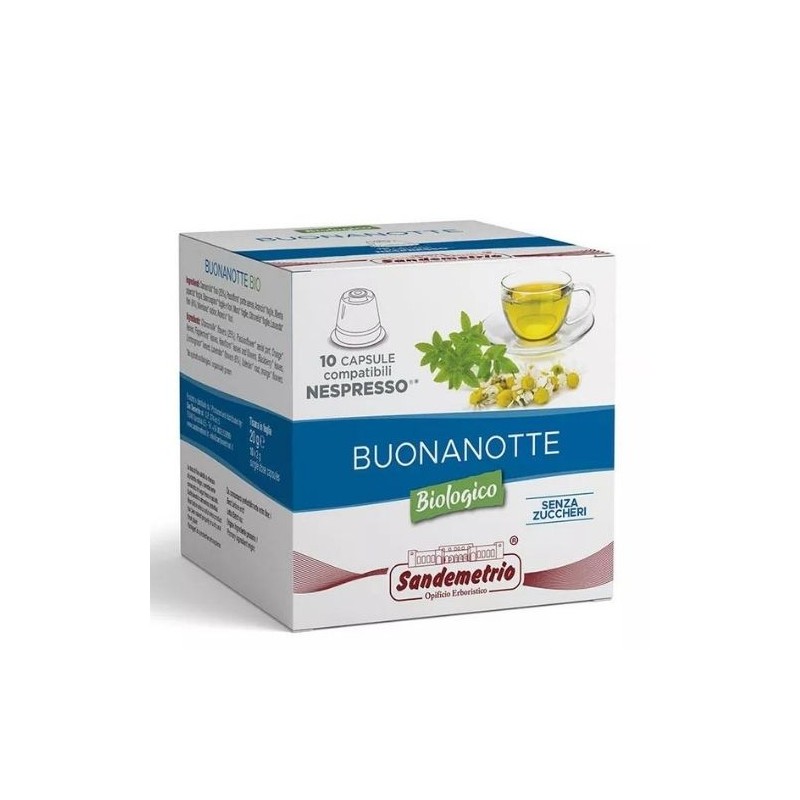 La tisana funzionale Buonanotte Sandemetrio è una miscela costituita da erbe officinali quali Passiflora, Camomilla, Arancio, Biancospino, Verbena odorosa, Menta piperita, Mora, Lavanda e Valeriana. Se presa regolarmente può essere utile per favorire un sonno tranquillo e riposante. Origine: da agricoltura biologica