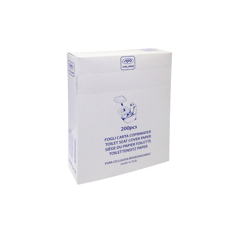 Carta copri WC bianca in fogli usa e getta. Composizione 50% cellulosa vergine e 50 % fibre riciclate. Forma del copri WC: rettangolare con fustellatura centrale ricalcante la sagoma del sedile. Dimensioni del copri WC: 42x37,5cm.