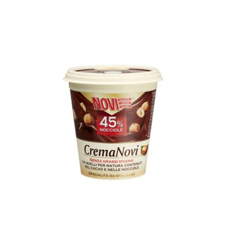 La Crema Novi,autentica specialità in un semplice contenitore.L'elevata quantità di nocciole selezionate delle nostre colline conferisce naturalmente alla Crema Novi una spalmabilità ideale senza aggiunta di grassi diversi da quelli per natura contenuti nelle nocciole e nel cacao. Confezione 200 gr