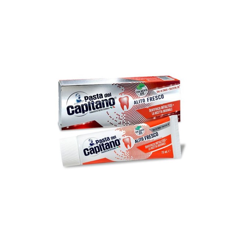 Il dentifricio Pasta del Capitano Alito Fresco assicura un’efficace azione contro l’alitosi grazie ai sali di zinco, al prezzemolo e agli estratti di basilico. La molecola Sulfetal Zn previene la formazione della flora batterica in bocca, principale causa di alitosi.
