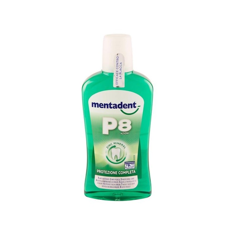 La speciale formula di Mentadent P8 Azioni, contiene Zinc Mineral ed offre una protezione efficace e delicata per la tua bocca. La sua formula offre 8 efficaci azioni per prevenire i principali problemi orali. Per una protezione completa di denti e gengive. Confezione 500 ml