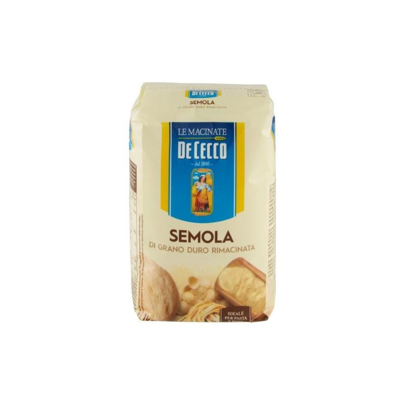 La Semola di grano duro rimacinata De Cecco,è particolarmente adatta per la realizzazione di fragrante pane fatto in casa e per la preparazione manuale o con la macchina automatica di ottime fettuccine,maccheroni alla chitarra,gnocchi,lasagne per timballo,cannelloni e qualsiasi altro formato anche senza uova.