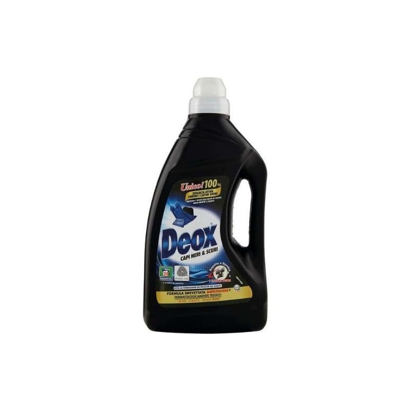 Istruzioni per l'uso: Deox Capi Neri e Scuri è indicato per tutti i capi delicati, anche lana e seta, e gli indumenti intimi, sia a mano che in lavatrice. La sua formula specifica, arricchita con enzimi, previene lo stingimento dei colori (risultati visibili dopo 8 lavaggi), la degenerazione delle fibre e l'antiestetica formazione dei pelucchi (azione anti-pilling). Inoltre evita il trasferimento dei colori da un capo all'altro. In lavatrice: Controlla sui capi le indicazioni per il lavaggio, scegliendo sempre le temperature più basse, senza eccedere nelle dosi. Utilizzare i programmi specifici per lana e delicati, rispettando i carichi di bucato indicati per non danneggiare gli indumenti. A mano: Versa il prodotto in 5 litri d'acqua fredda prima di immergere i capi e lasciali in ammollo per alcuni minuti. Non torcere i capi dopo il risciacquo. Nel caso di capi colorati nuovi, in particolare se di cotone, si può verificare una naturale perdita di colore; per questo di consiglia per le prime volte di lavare i capi colorati nuovi a mano, per verificare la stabilità intrinseca dei colori. 1 Tappo = 37ml
