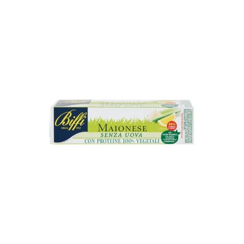 La maionese senza uova Biffi è fatta al 100% con ingredienti Vegetali.Un prodotto delicato e adatto alle intolleranze: in questo condimento le uova sono state sostituite con proteine 100% Vegetali.La ricetta 100% Vegetale apporta il 30% in meno di grassi rispetto alla versione classica.Senza Glutine.Senza Uova.Confezione 143 gr