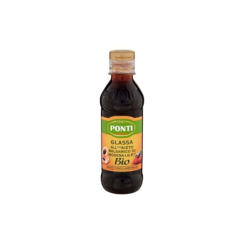 Qualità L'incontro tra pregiato "Aceto Balsamico di Modena IGP" biologico Ponti e mosto cotto biologico. Gusto Pieno e agrodolce, dalla moderata acidità, con un profumo di mosto cotto. Ideale con carne, uova, pesce e verdure. Perfetta per decorare e arricchire di sapore dolci, frutta e gelato. Senza glutine