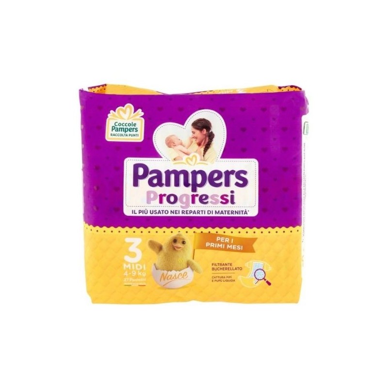 Per i primi mesi di vita dei bimbi, quando la loro pappa è liquida, Pampers Progressi ha studiato il pannolino con l'esclusivo filtrante a fori larghi "Cattura Pupù liquida".
