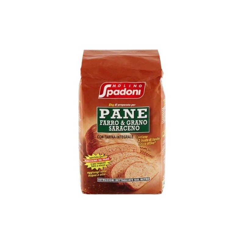1 Kg di preparato per Pane Farro & Grano Saraceno con farina integrale e semola di grano duro. Contiene 2 buste di lievito secco attivo. Speciale per macchine da pane e per impasti fatti a mano. Aggiungi solo